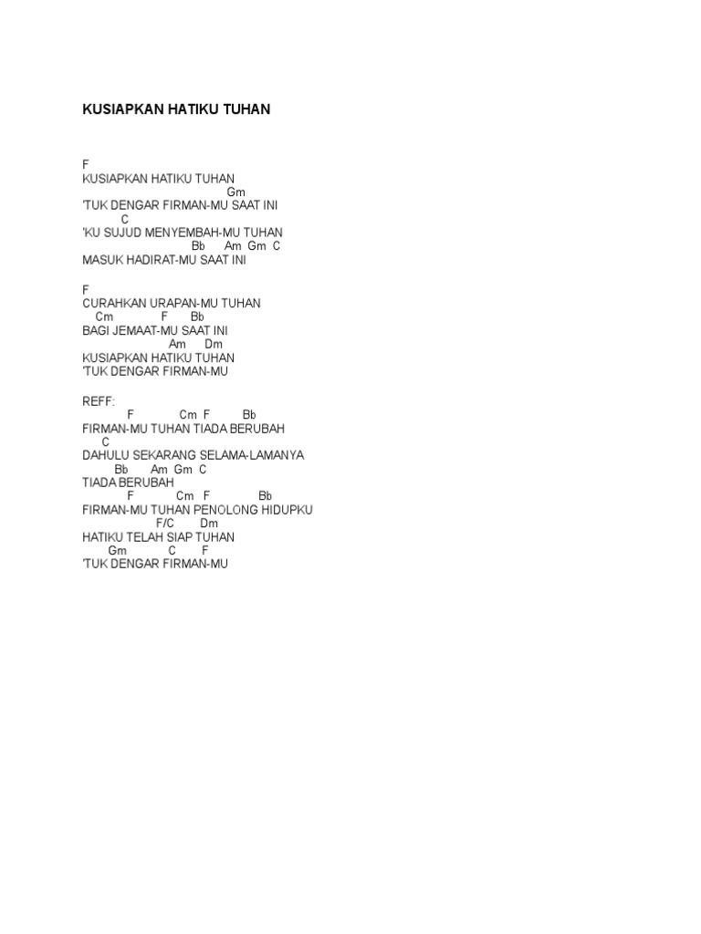 Lirik Lagu Ku Siapkan Hatiku Tuhan - Doc Teks Lagu Meirina Malau Academia Edu : Lagu ini dinyanyikan oleh natashia nikita.. A kusiapkan hatiku tuhan d tuk dengar firmanmu saat ini bm ku sujud menyembahmu tuhan e d a e masuk hadiratmu saat ini a curahkan urapanmu tuhan d bagi jemaatmu saat ini d#dim a/e f#m kusiapkan hatiku tuhan bm e a e tuk dengar firmanmu reff : G g gm7 kusiapkan hatiku tuhan g6 g7 c c e/b tuk dengar firmanmu saat ini am ku sujud menyembahmu tuhan d7 go g dsus d dalam hadiratmu saat ini g gm7 curahkan urapanmu tuhan g6 g7 c c#o bagi jemaatmu saat ini bm/d em kusiapkan hatiku tuhan Kusiapkan hatiku, tuhan, mendengar firmanmu. Mar 21, 2010 · syair dan lagu: Ku siapkan hatiku tuhan hank samuel key:
